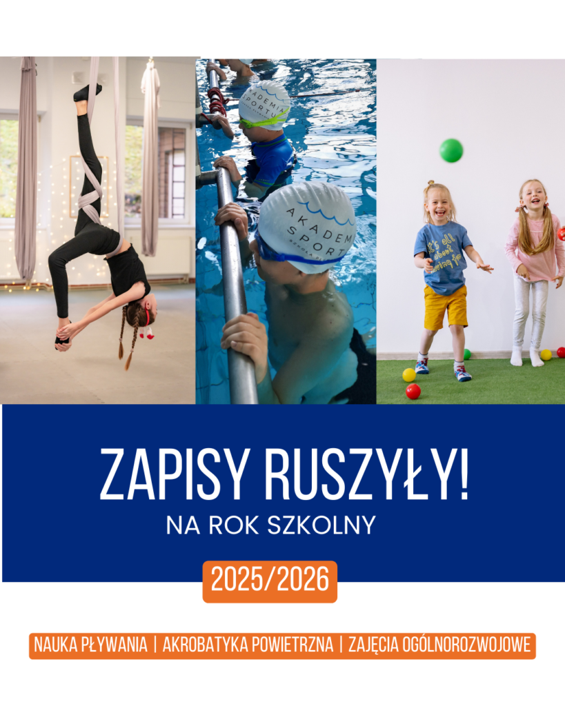 Informujemy, że ruszyły zapisy na nowy rok szkolny. Oferujemy naukę pływania dla dzieci na basenie oraz zajęcia na Sali Sportu, w ramach których proponujemy: zajęcia ogólnorozwojowe Active Fun, akrobatykę powietrzną – Aerial Kids oraz zajęcia muzyczno-ruchowe dla najmłodszych.